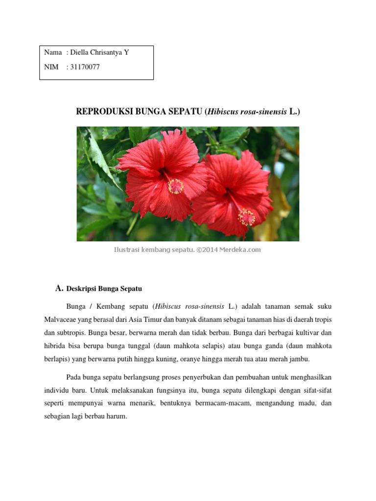 Bunga kembang sepatu Hibiscus rosa-sinensisL adalah tanaman yang tumbuh subur di beberapa negara seperti Indonesia yang salah satunya dapat digunakan sebagai obat herbal. Mengetahui manfaat bunga sepatu C. Tanaman Bunga Kembang Sepatu Kembang sepatu ditanam sebagai tanaman hias atau tanaman pagar karena bunganya beraneka warna.